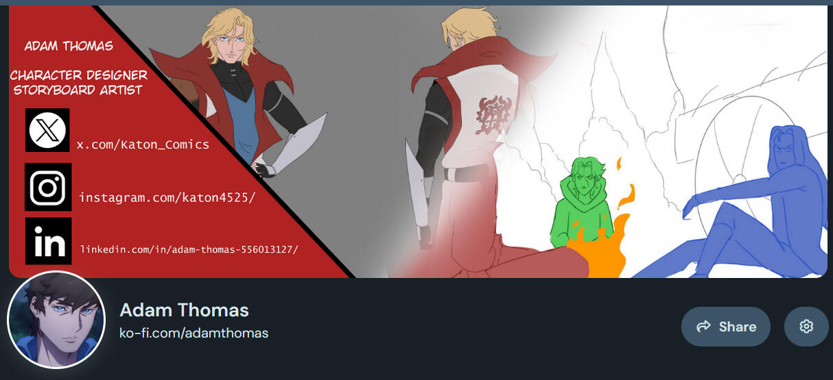 Welcome to my personal site powered by Carrd! Super happy to have this finally up and running. Here you will find updates as well as art dumps and a way to see services I offer for art!I'm Katon, a freelance character and storyboard artist. Open to workIf you don't know, I have been working on a Castelavnia project for some time now. Doing character designs and some storyboards. I will be updating this place as I go but you can usually find updates over on my Bsky account.